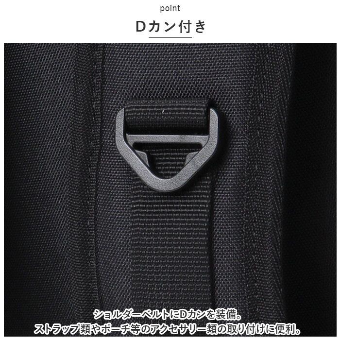 ・ショルダーベルトにDカンを装備。ストラップ類やポーチ等のアクセサリー類の取り付けに便利。