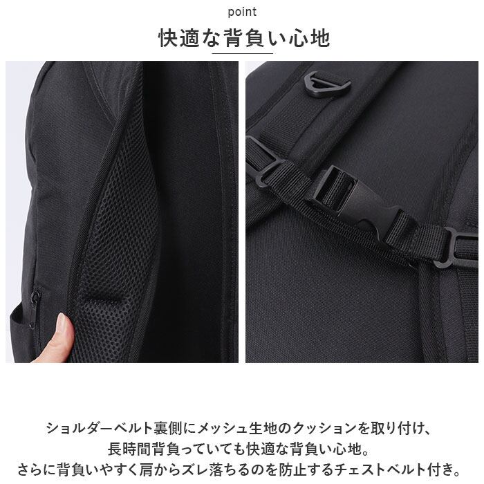 ・さらに背負いやすく肩からズレ落ちるのを防止するチェストベルト付き。