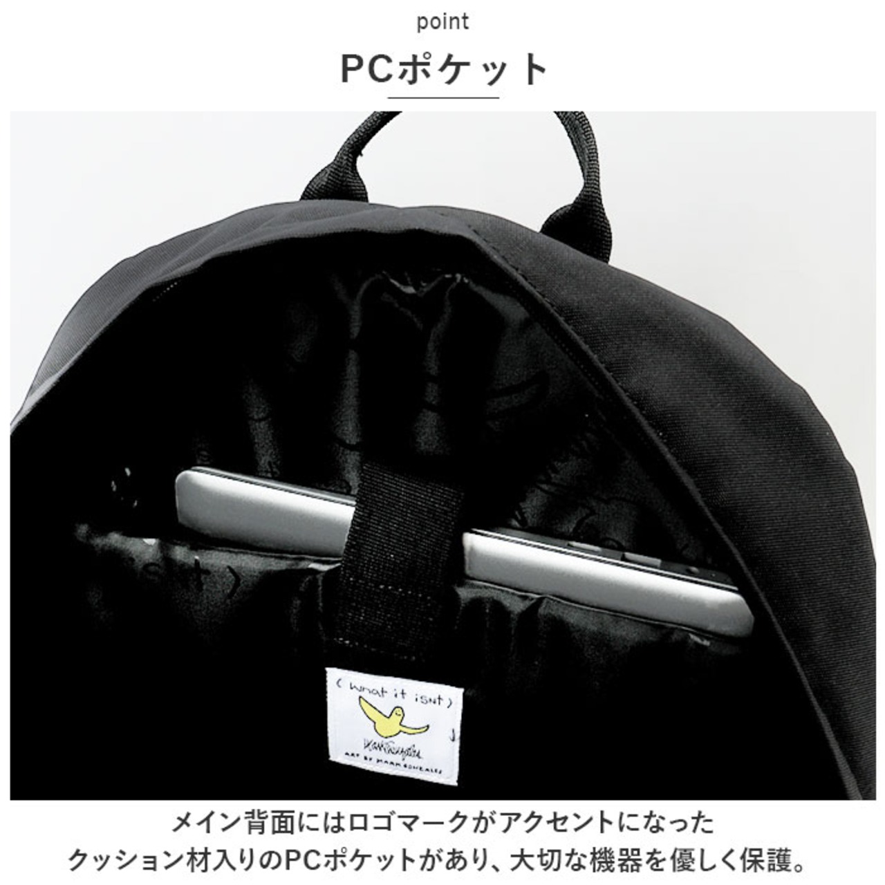 ・メイン背面にはロゴマークがアクセントになったクッション材入りのPCポケットがあり、大切な機器を優しく保護。