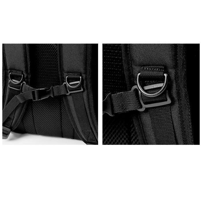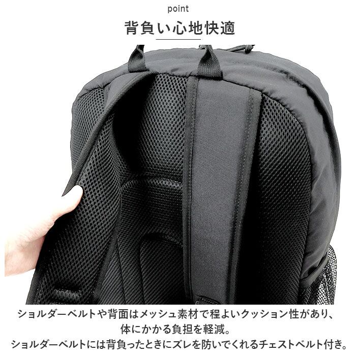 ・ショルダーベルトや背面はメッシュ素材で程よいクッション性があり、体にかかる負担を軽減。ショルダーベルトには背負ったときにズレを防いでくれるチェストベルト付き。