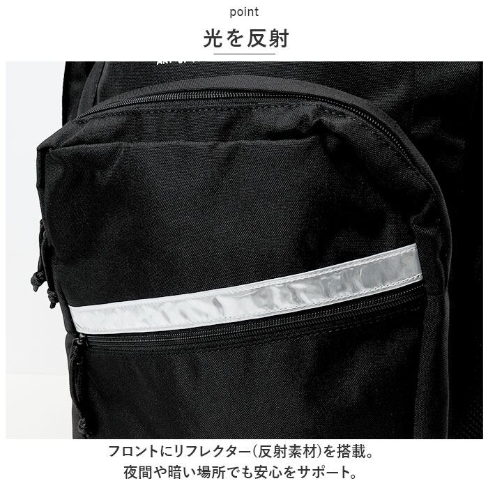 ・フロントにリフレクター(反射素材)を搭載。夜間や暗い場所でも安心をサポート。
