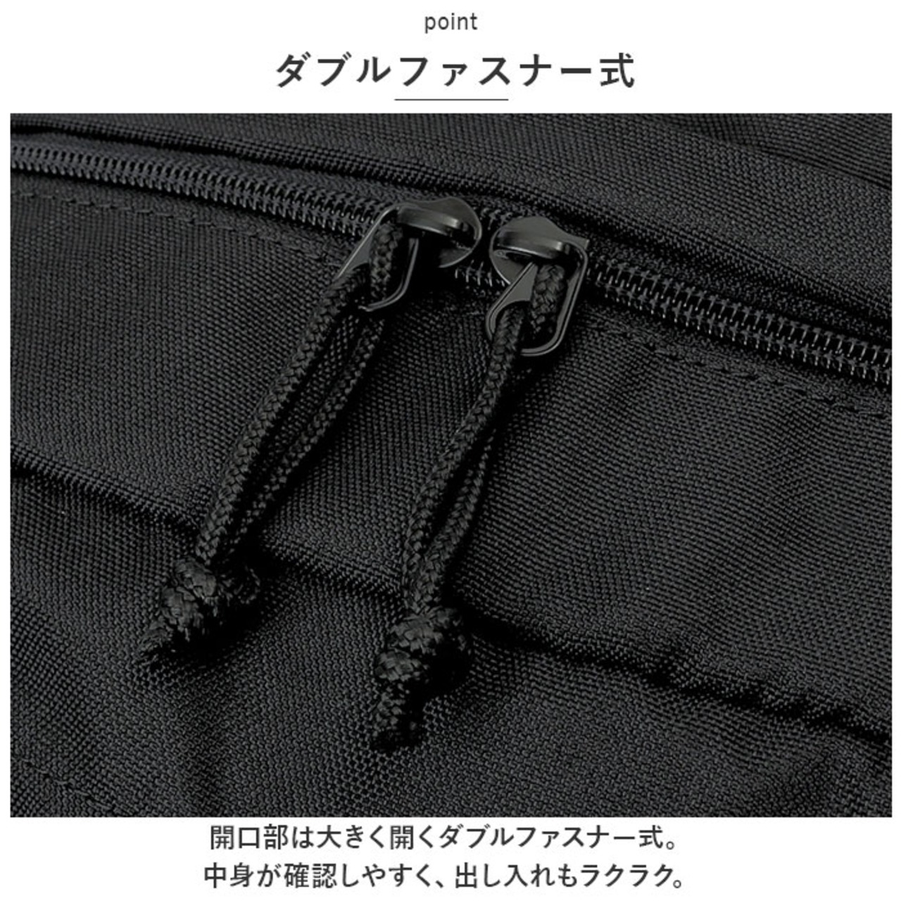 ・開口部は大きく開くダブルファスナー式。中身が確認しやすく、出し入れもラクラク。
