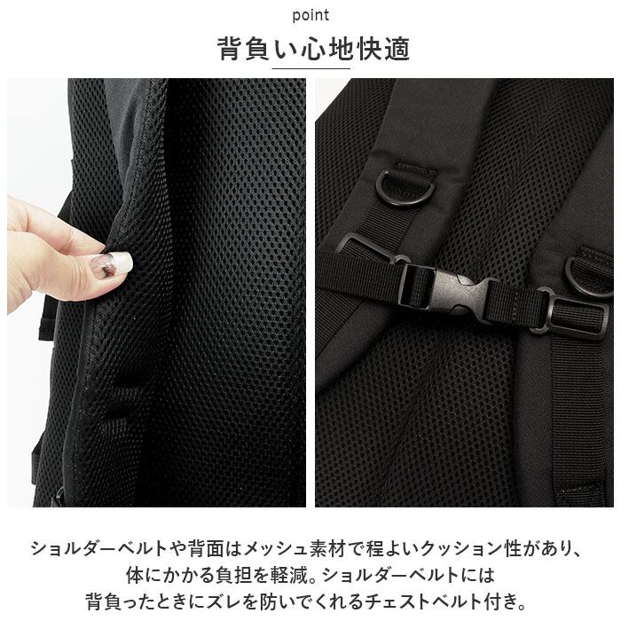 ・ショルダーベルトや背面はメッシュ素材で程よいクッション性があり、体にかかる負担を軽減。ショルダーベルトには背負ったときにズレを防いでくれるチェストベルト付き。