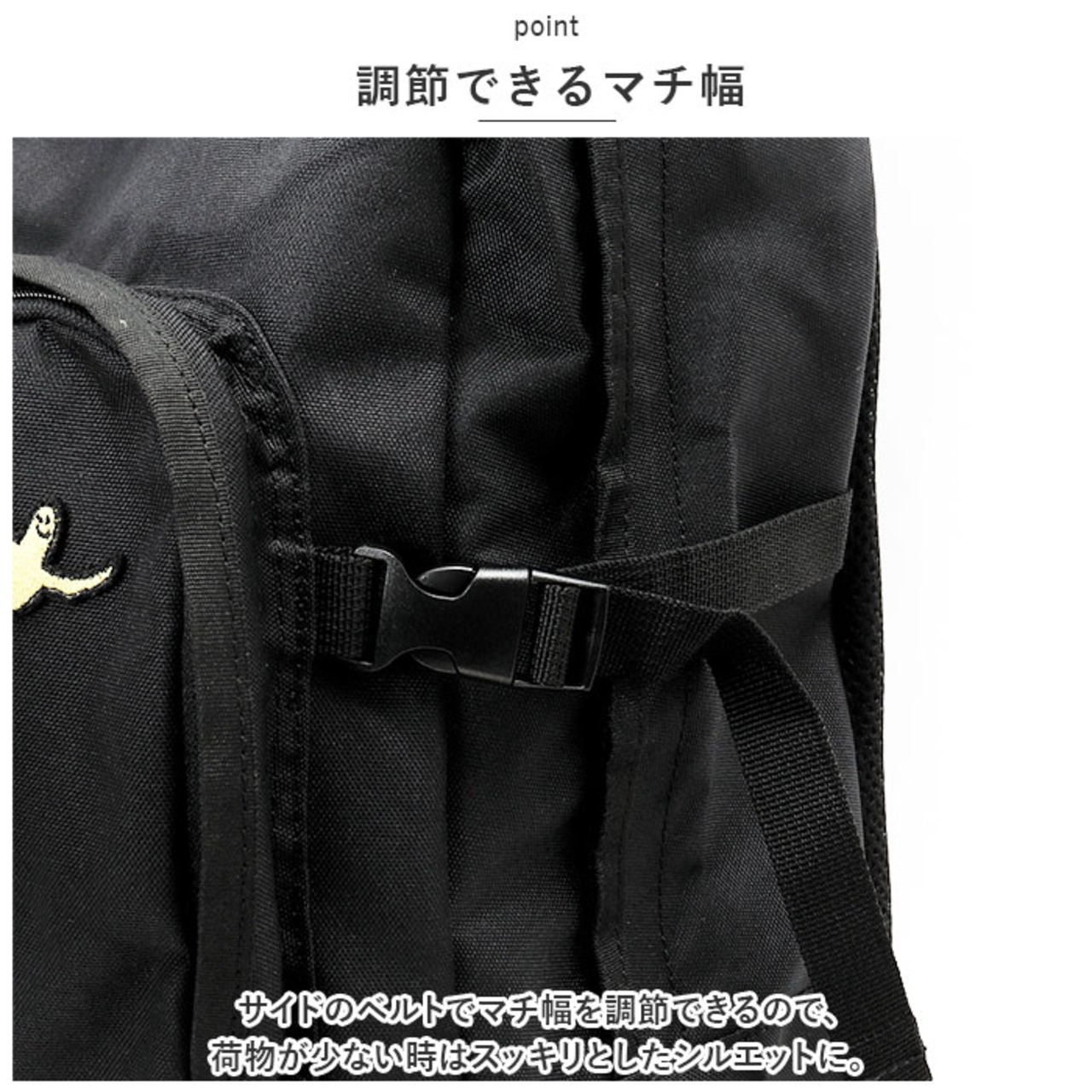 ・サイドのベルトでマチ幅を調節できるので、荷物が少ない時はスッキリとしたシルエットに。