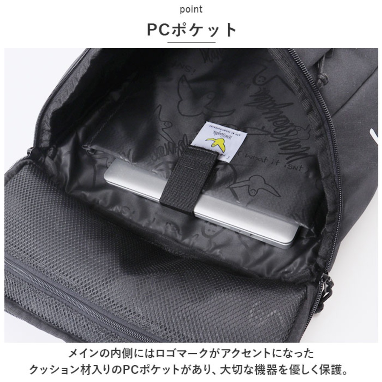 ・メインの内側にはロゴマークがアクセントになったクッション材入りのPCポケットがあり、大切な機器を優しく保護。