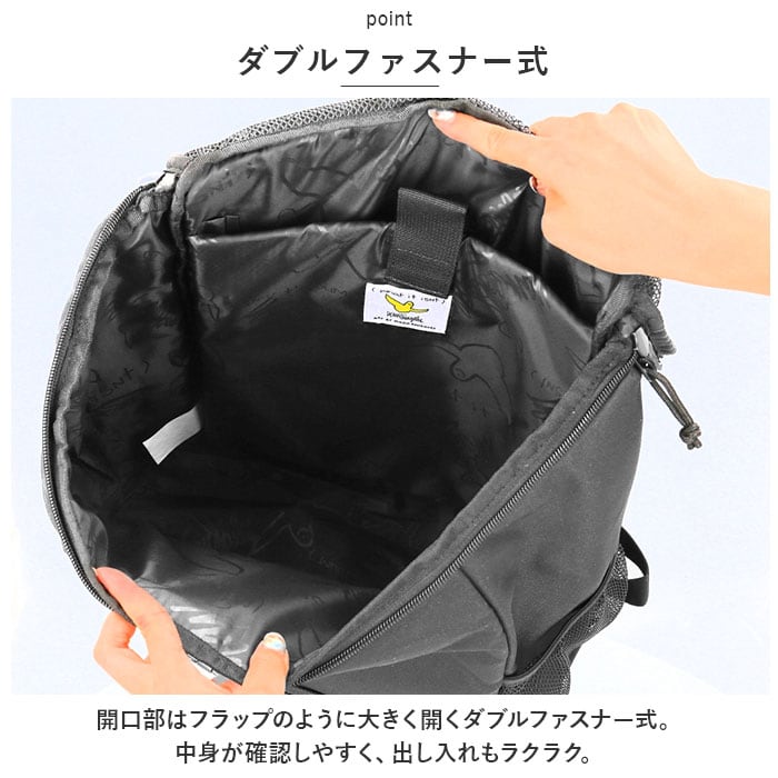 ・開口部はフラップのように大きく開くダブルファスナー式。中身が確認しやすく、出し入れもラクラク。