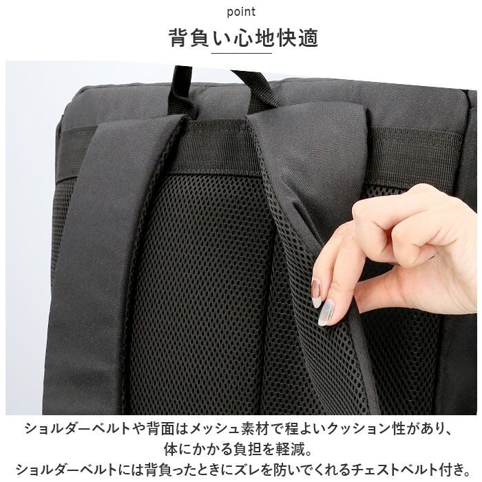 ・ショルダーベルトや背面はメッシュ素材で程よいクッション性があり、体にかかる負担を軽減。ショルダーベルトには背負ったときにズレを防いでくれるチェストベルト付き。