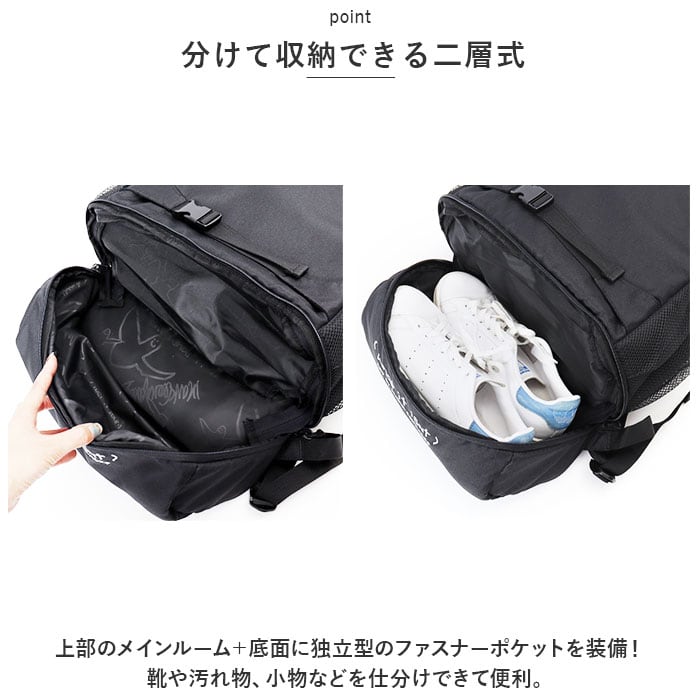 ・上部のメインルーム+底面に独立型のファスナーポケットを装備!靴や汚れ物、小物などを仕分けできて便利。