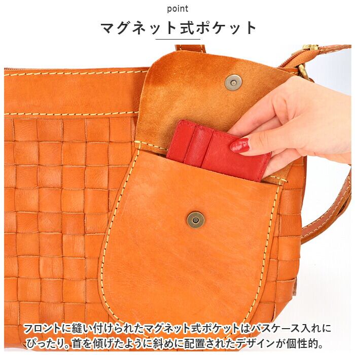 ・フロントに縫い付けられたマグネット式ポケットはパスケース入れにぴったり。首を傾げたように斜めに配置されたデザインが個性的。