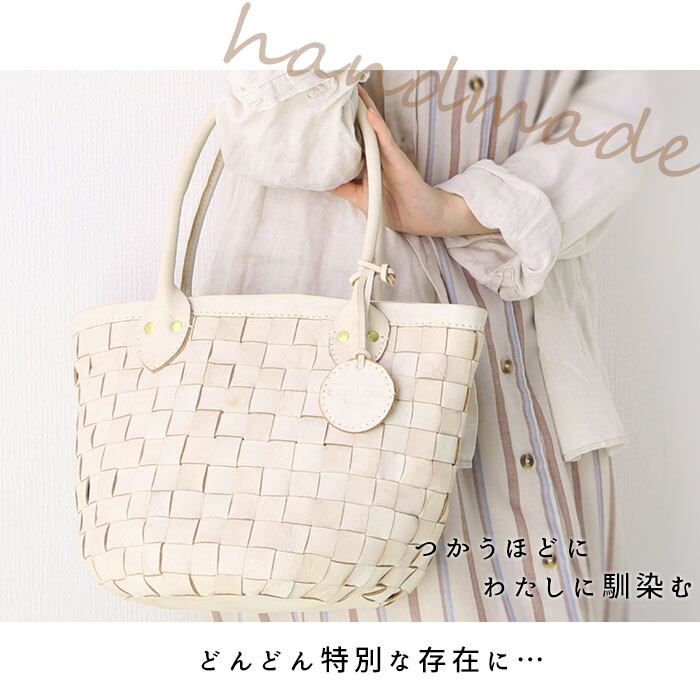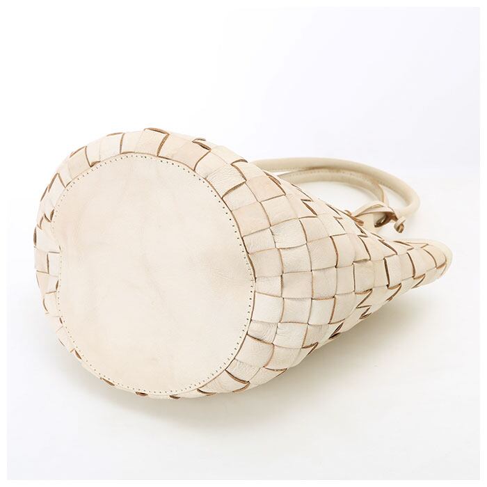 ・1枚ずつ手で染めては天日で乾かすなどの工程を何度も繰り返して仕上げた、カウレザーに白い塗料を吹きかけドラム(太鼓)でまわしメッシュ状にした革を、一本一本職人が手編みにて作り上げ、アインティーク調な白いヌメ革を表現。