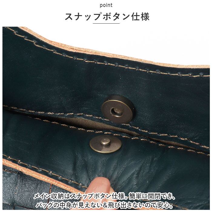 ・メイン収納はスナップボタン仕様。簡単に開閉でき、バッグの中身が見えない&飛び出さないので安心。