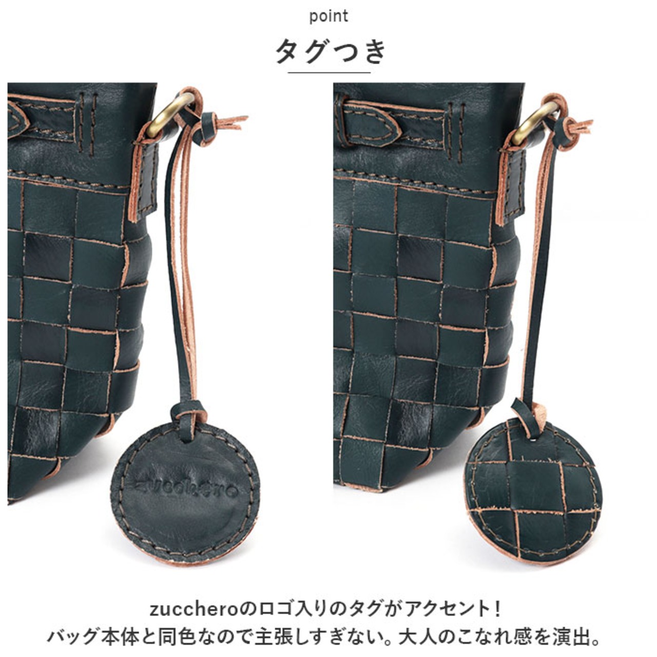・zuccheroのロゴ入りのタグがアクセント!バッグ本体と同色なので主張しすぎない。大人のこなれ感を演出。