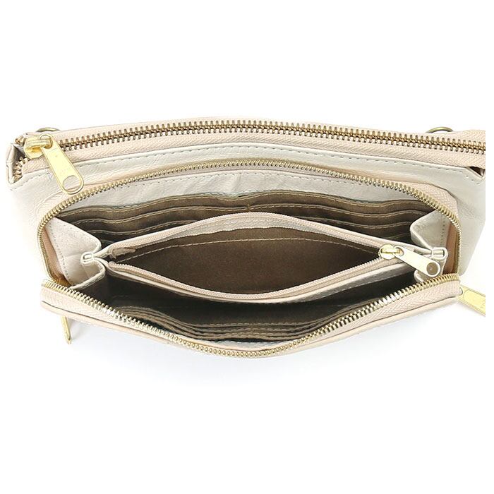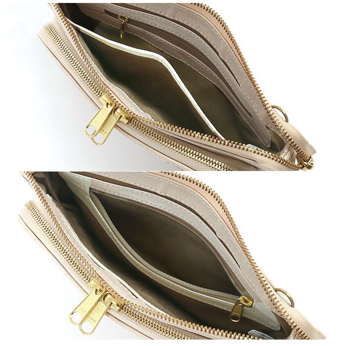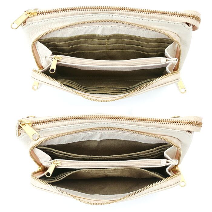 ・メイン収納スペースは、コスメ小物やキーケースを入れるのにちょうどいいサイズ感♪内側にファスナーポケット×1つ、オープンポケット×1つ付きで、スリムながらもポケットが充実。