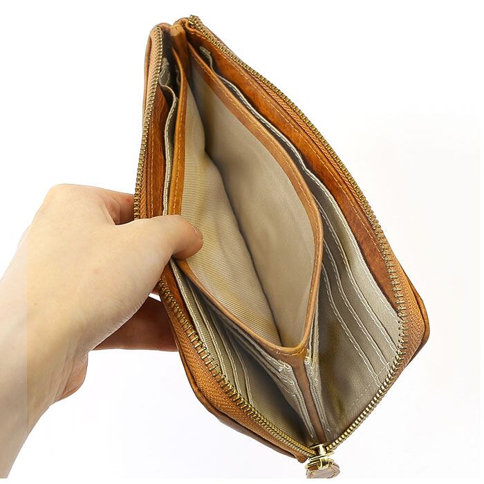 ・開口部はL字ファスナー式で大きく開閉し、中身が見やすいのがポイント。