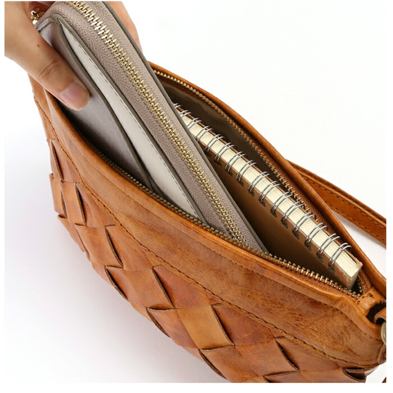 ・長財布やA5サイズの手帳が収納可能な、使い勝手のよいサイズ感♪開口部はファスナー式で、バッグの内側が見えてしまう心配がなく、プライバシーをしっかり確保。