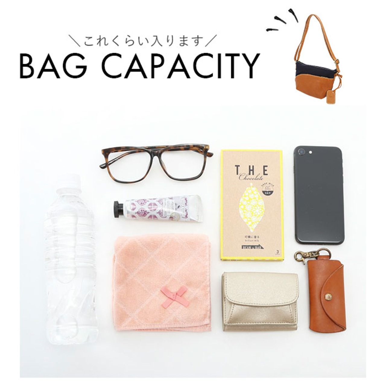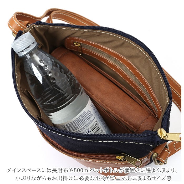・メインスペースには長財布や500mlペットボトルが横置きに程よく収まり、小ぶりながらもお出掛けに必要な小物がミニマルに収まるサイズ感。