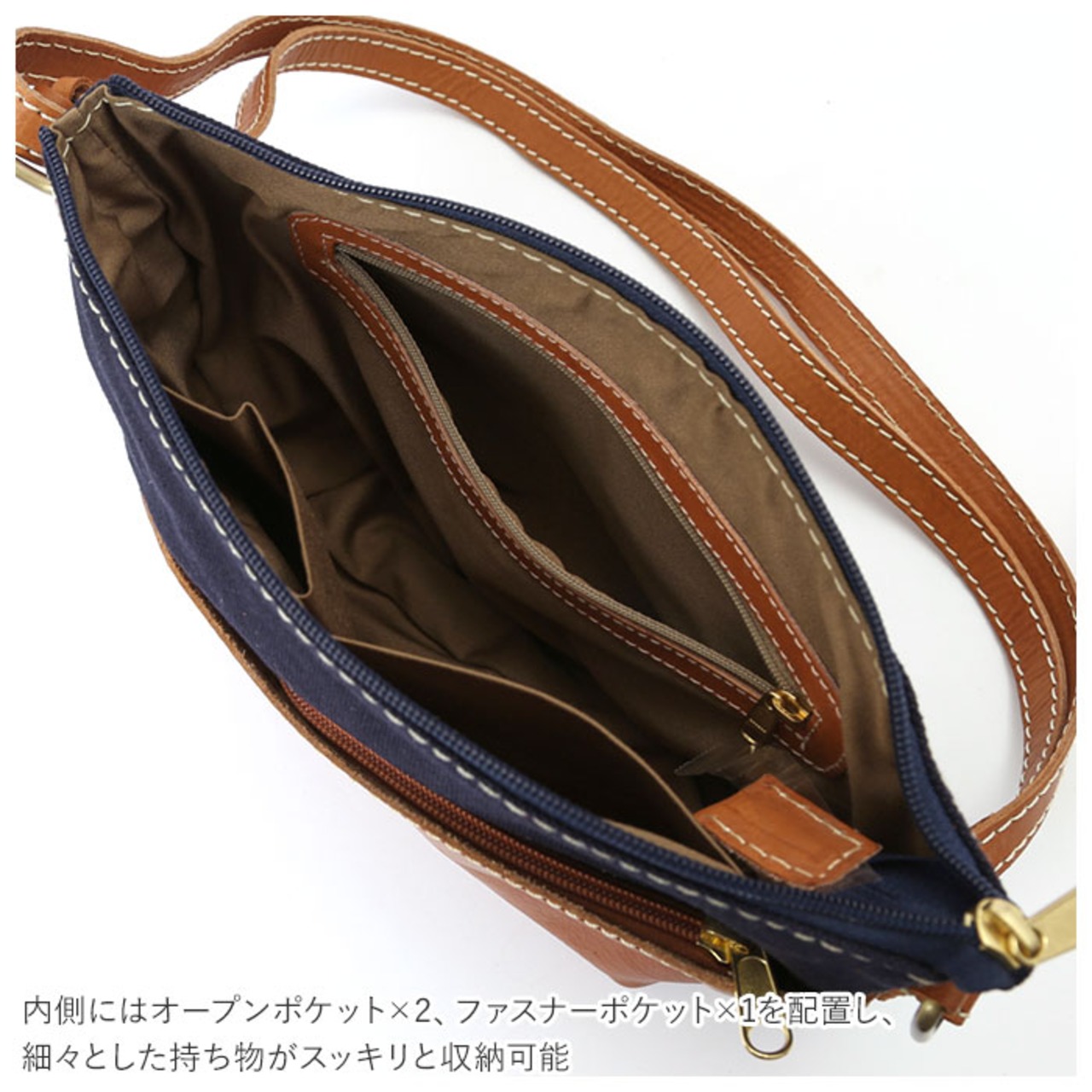 ・内側にはオープンポケット×2、ファスナーポケット×1を配置し、細々とした持ち物がスッキリと収納可能。