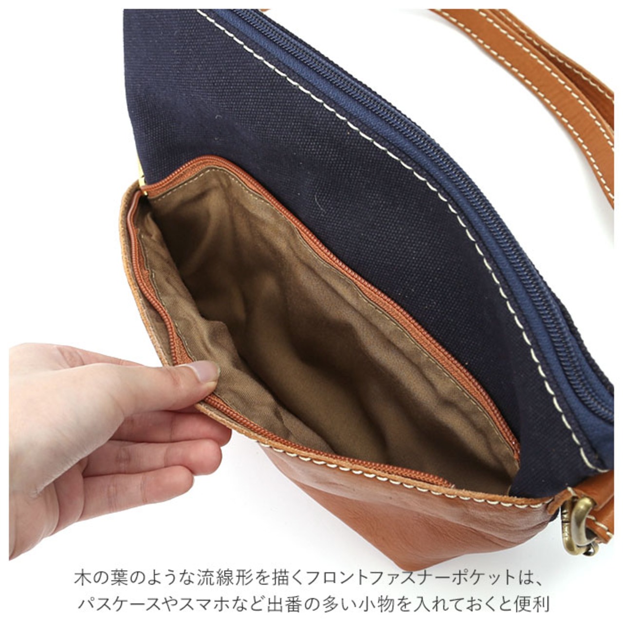 ・木の葉のような流線形を描くフロントファスナーポケットは、パスケースやスマホなど出番の多い小物を入れておくと便利。