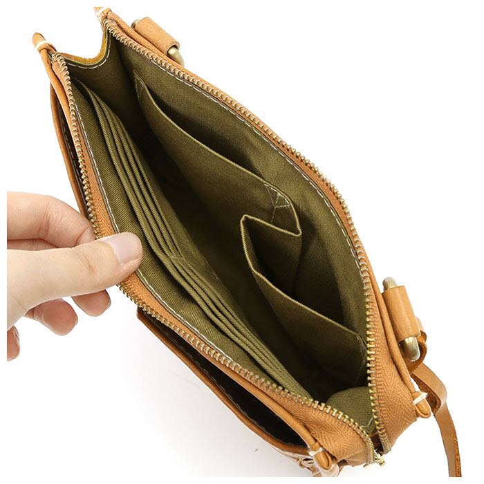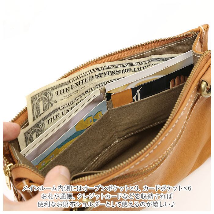 ・メインルーム内側にはオープンポケット×3、カードポケット×6を設け、お札や通帳、クレジットカードなどを収納すれば便利なお財布ショルダーとして使えるのが嬉しいポイント!