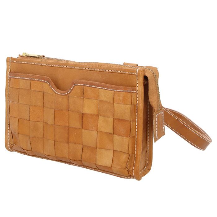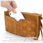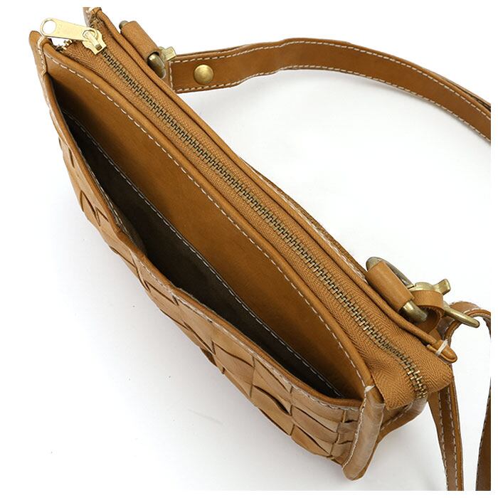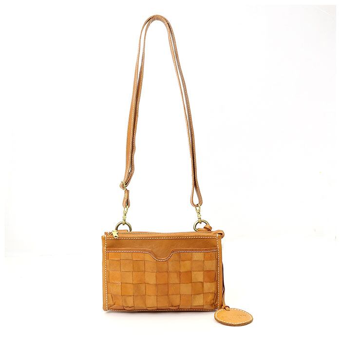 ・本格レザーをバスケットのように編み込んだ素材使いが可愛い!手作り感あふれるコンパクトなミニショルダーバッグ。