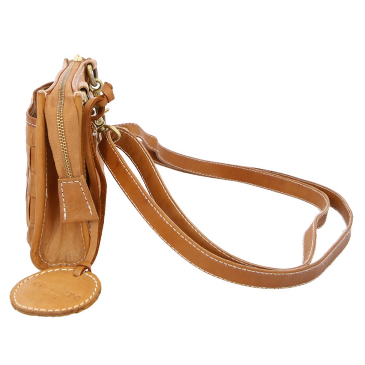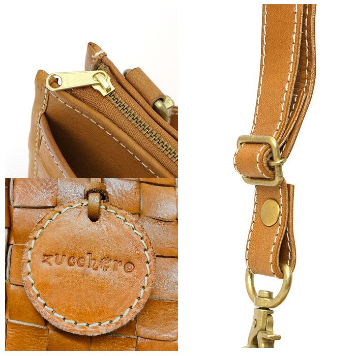 ・使い込むほどに味わいが増す、ナチュラルレザー素材ならではの経年変化も楽しめる。「zucchero」のロゴが刻印された、本体と同じ素材のレザータグ付き。
