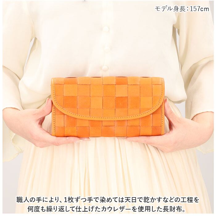 ・職人の手により、1枚ずつ手で染めては天日で乾かすなどの工程を何度も繰り返して仕上げたカウレザーを使用した長財布。