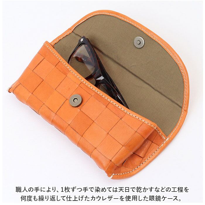 ・職人の手により、1枚ずつ手で染めては天日で乾かすなどの工程を何度も繰り返して仕上げたカウレザーを使用した眼鏡ケース。