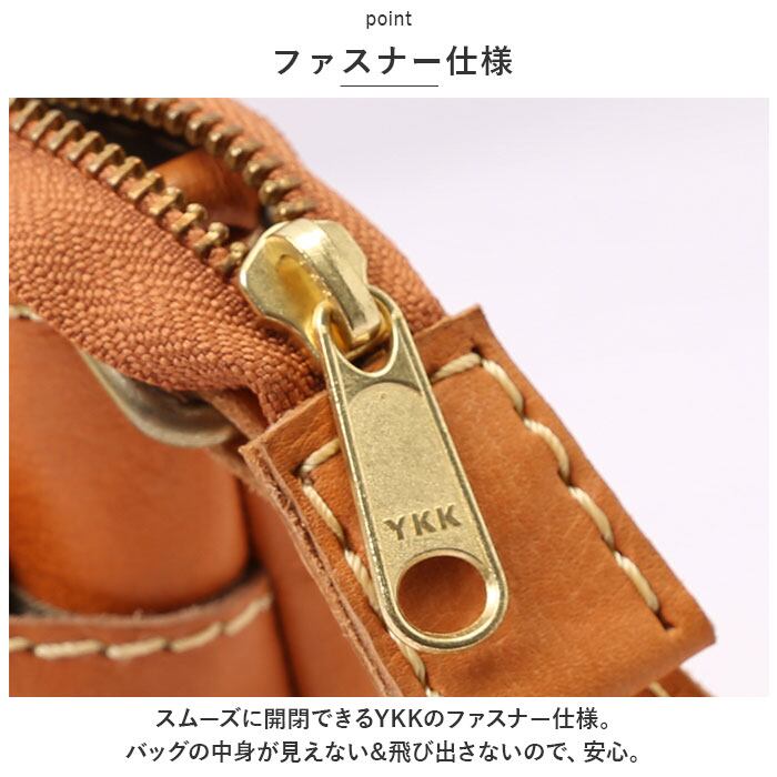 ・スムーズに開閉できるYKKのファスナー仕様。バッグの中身が見えない&飛び出さないので、安心。