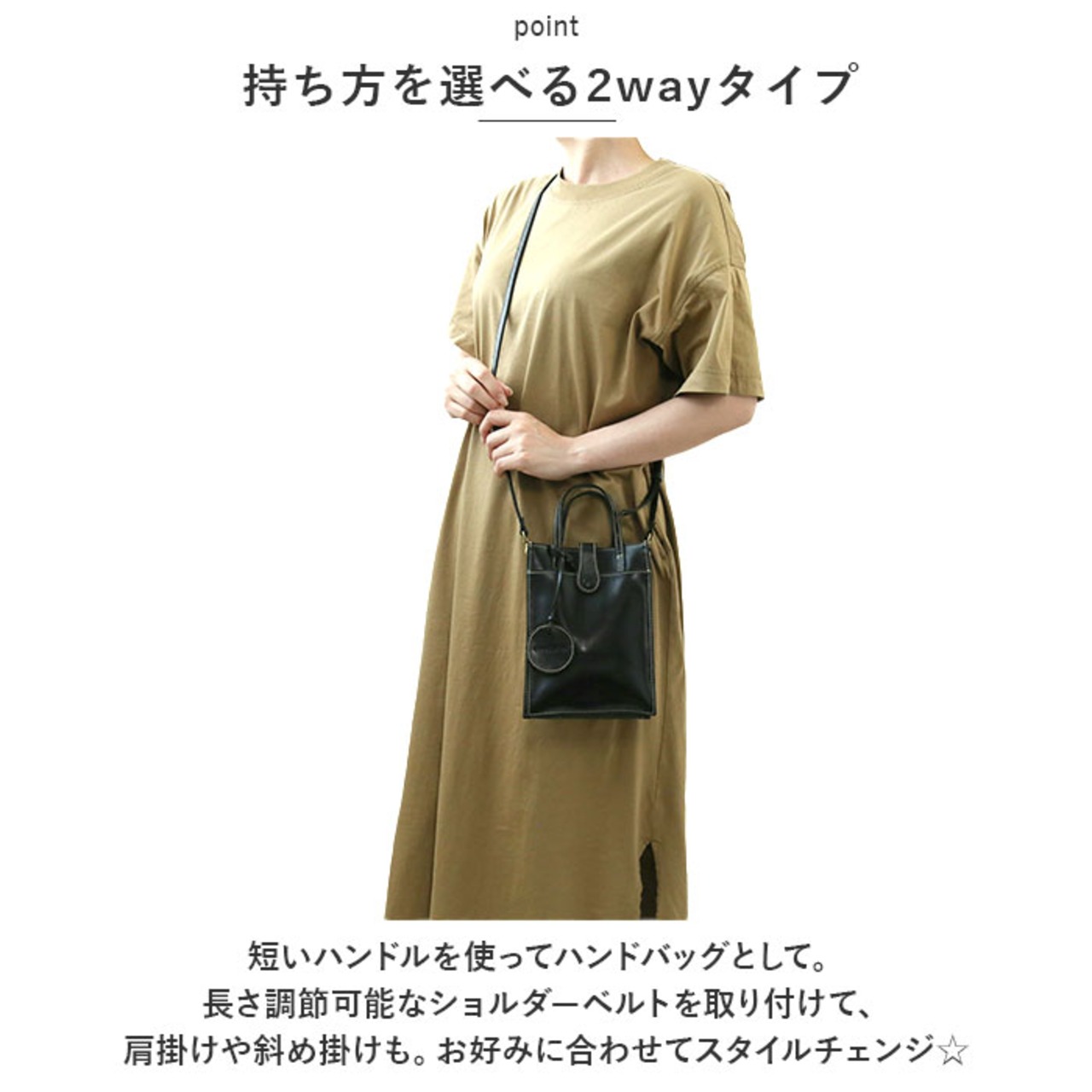 ・短いハンドルを使ってハンドバッグとして。長さ調節可能なショルダーベルトを取り付けて、肩掛けや斜め掛けも。お好みに合わせてスタイルチェンジ☆