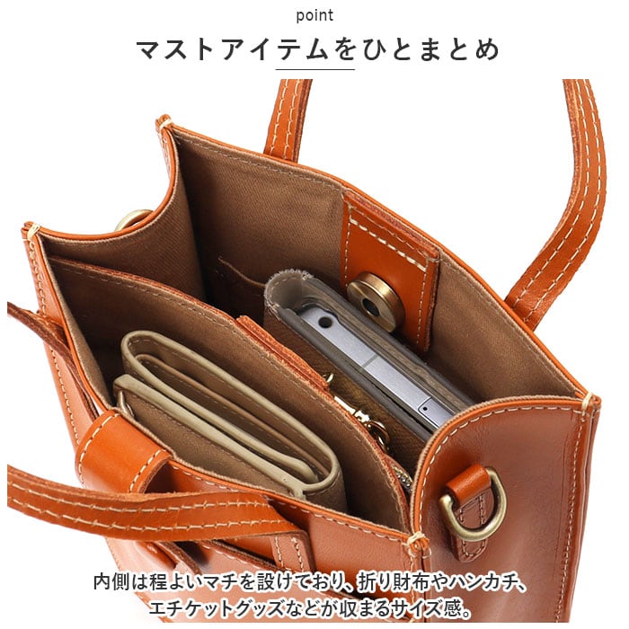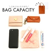・内側は程よいマチを設けており、折り財布やハンカチ、エチケットグッズなどが収まるサイズ感。