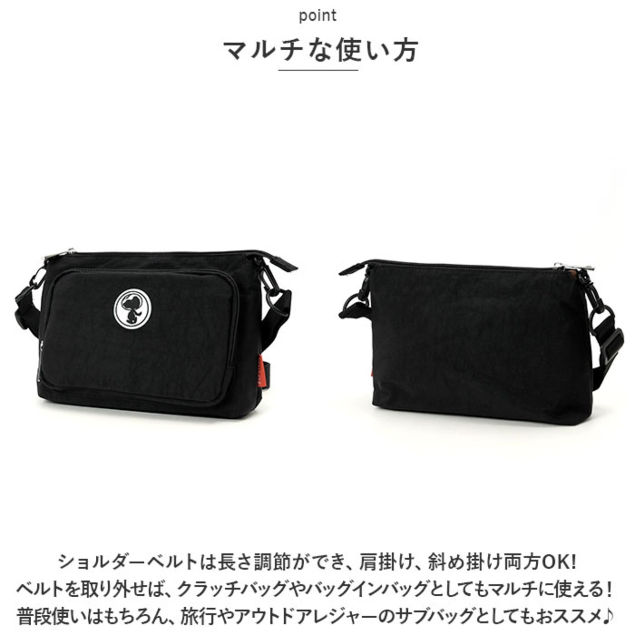・ショルダーベルトは長さ調節ができ、肩掛け、斜め掛け両方OK!