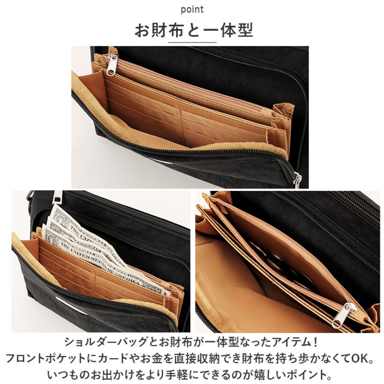 ・ショルダーバッグとお財布が一体型なったアイテム!フロントポケットにカードやお金を直接収納でき財布を持ち歩かなくてOK。いつものお出かけをより手軽にできるのが嬉しいポイント。