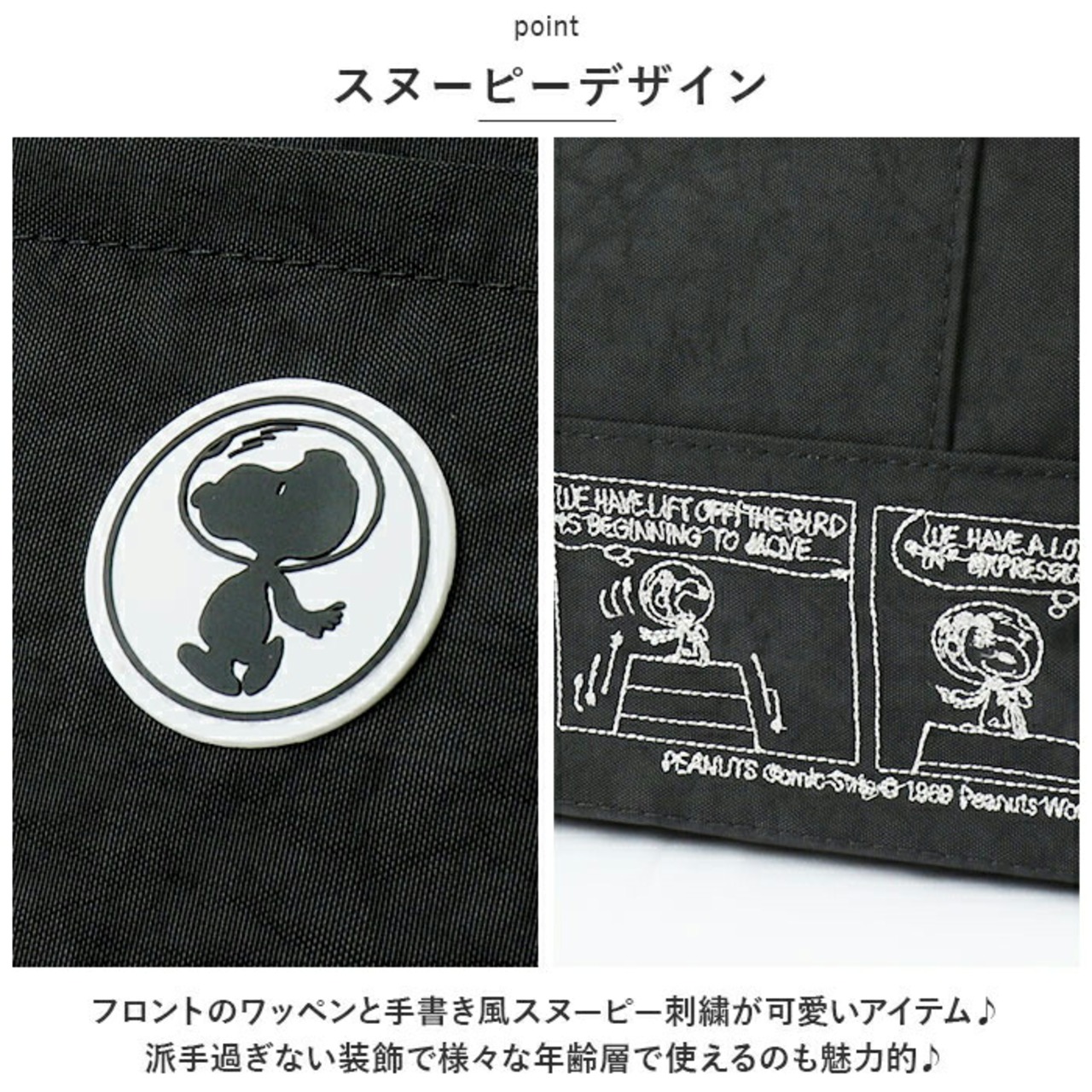 ・フロントのワッペンと手書き風スヌーピー刺繍が可愛いアイテム♪派手過ぎない装飾で様々な年齢層で使えるのも魅力的♪