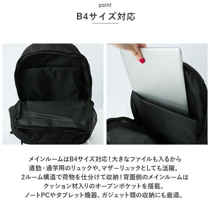 ・メインルームはB4サイズ対応!大きなファイルも入るから通勤・通学用のリュックや、マザーリュックとしても活躍。2ルーム構造で荷物を仕分けて収納!