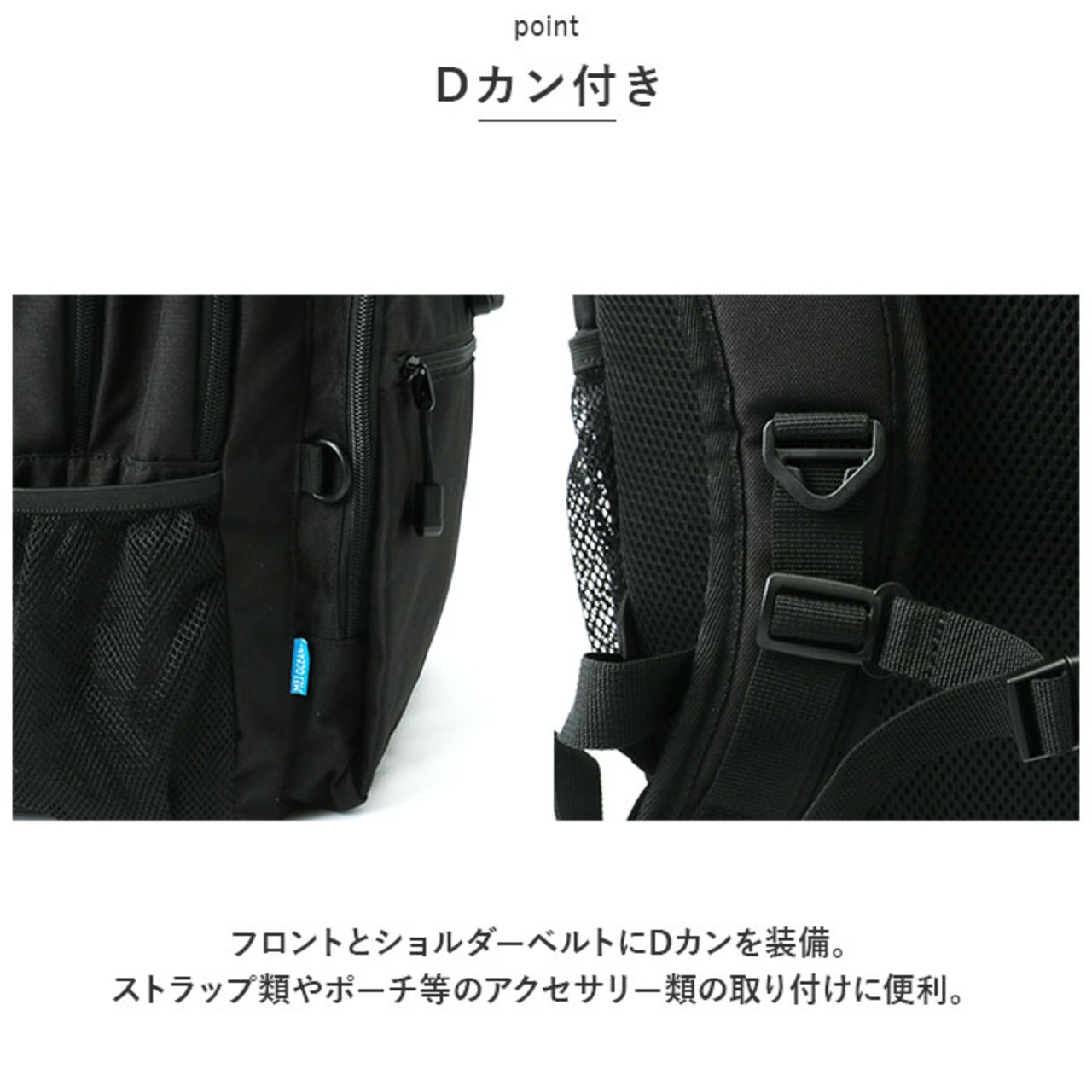 ・フロントとショルダーベルトにDカンを装備。ストラップ類やポーチ等のアクセサリー類の取り付けに便利。