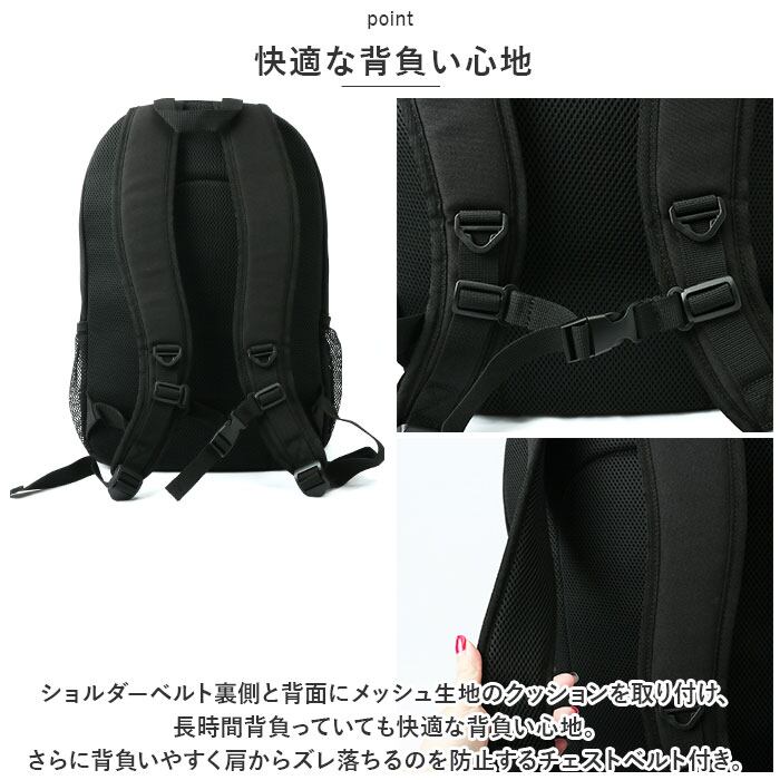 ・ショルダーベルト裏側と背面にメッシュ生地のクッションを取り付け、長時間背負っていても快適な背負い心地。