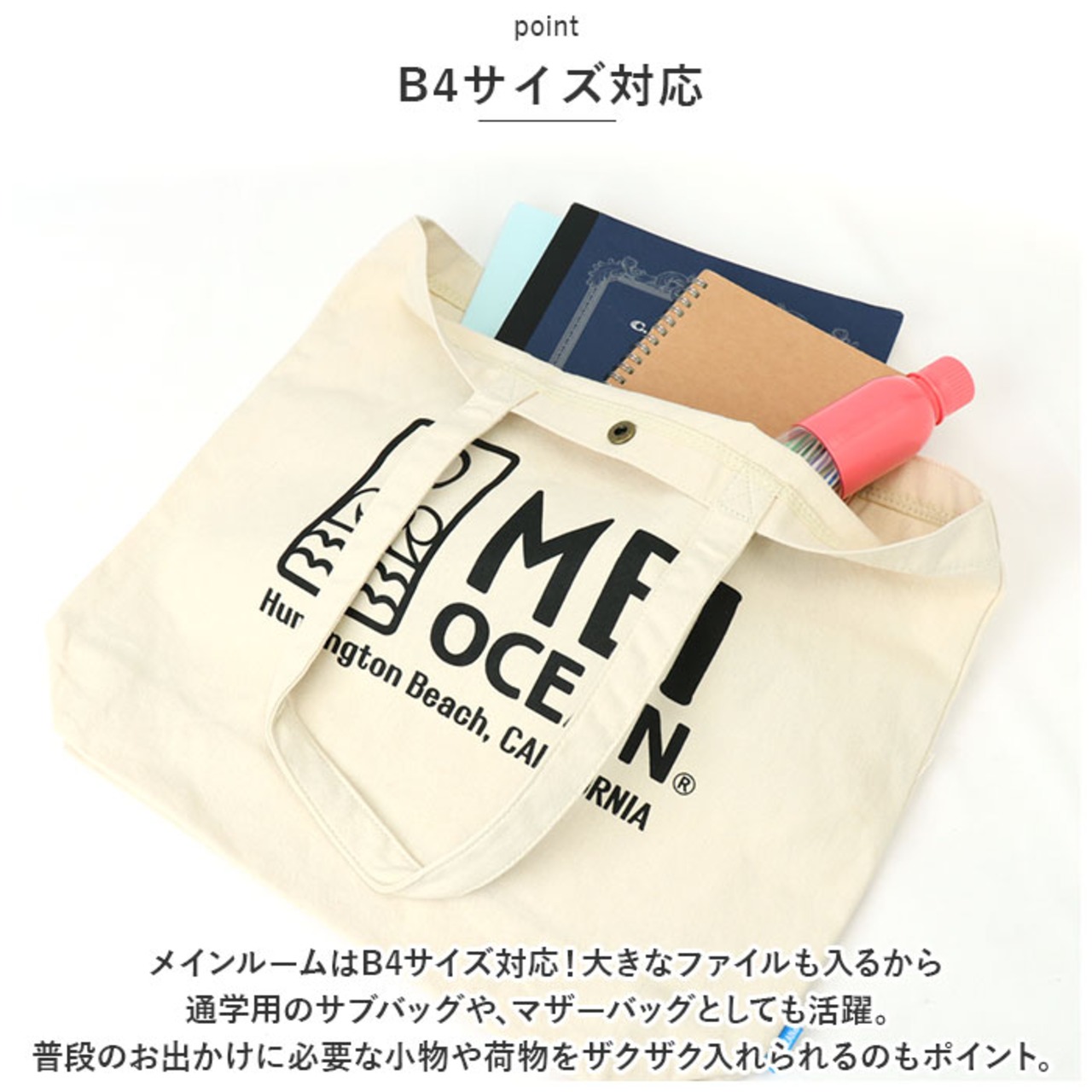 ・メインルームはB4サイズ対応!大きなファイルも入るから通学用のサブバッグや、マザーバッグとしても活躍。
