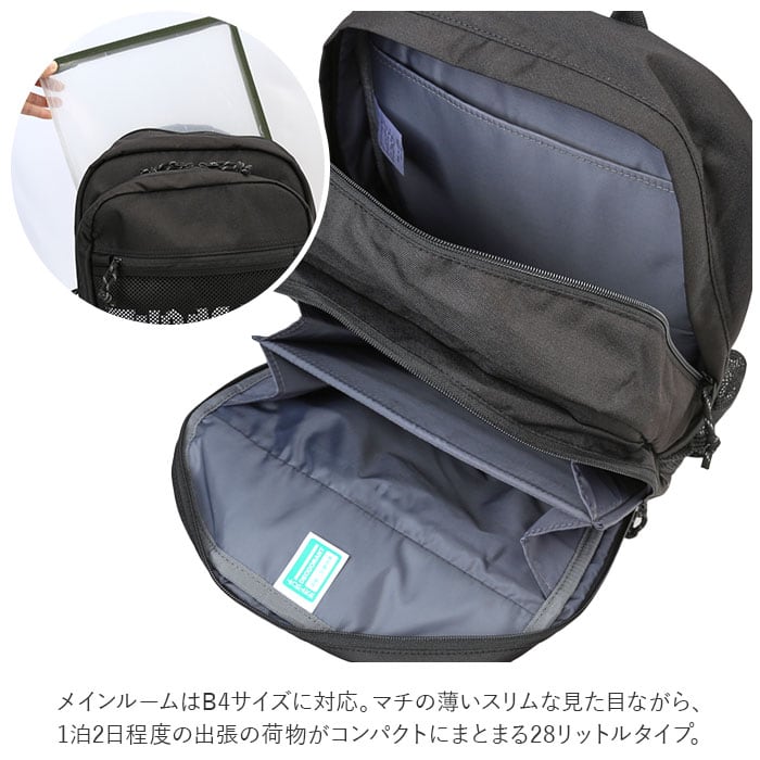 ・メインルームはB4サイズに対応。マチの薄いスリムな見た目ながら、1泊2日程度の出張の荷物がコンパクトにまとまる28リットルタイプ。