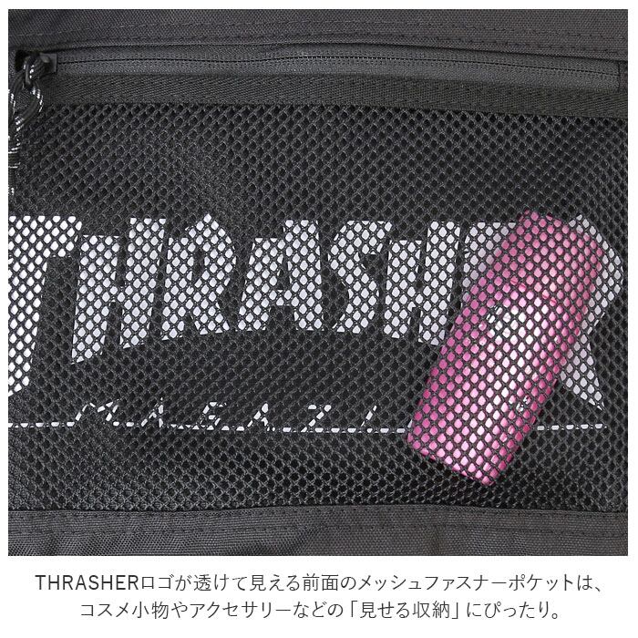 ・THRASHERロゴが透けて見える前面のメッシュファスナーポケットは、コスメ小物やアクセサリーを「見せる収納」にぴったり。