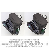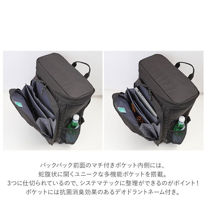 3つに仕切られた便利なつくりで、ノートPC、タブレット端末、スマホやお財布等の小物、といった風にシステマティックに整理ができるのがポイント!抗菌消臭効果のあるデオドラントネーム付きポケットなので、マスクのストックにも最適。