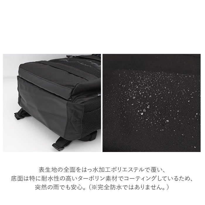 ・表生地の全面をはっ水加工ポリエステルで覆い、底面は特に耐水性の高いターポリン素材でコーティングしているため、突然の雨でも安心。(※完全防水ではありません。)