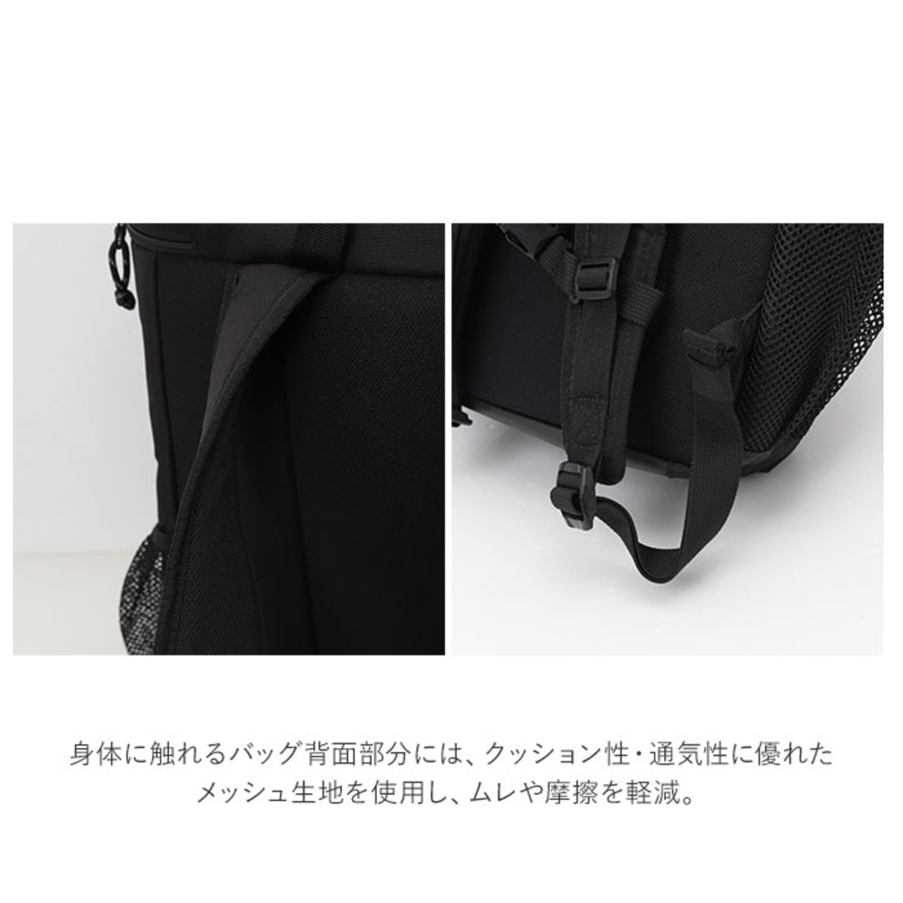 ・アウトドアで便利!バックパック両サイドには、500mlペットボトルや折りたたみ傘をちょこんと差し込めるメッシュポケットを配置。