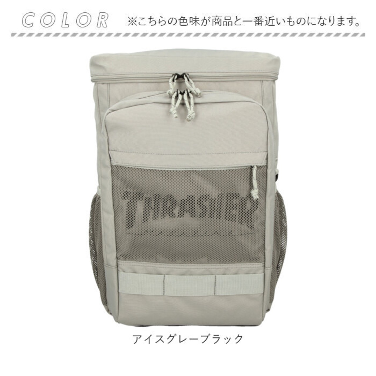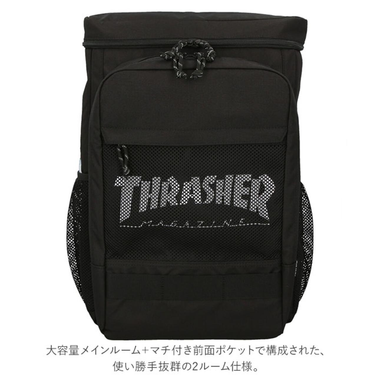 ・THRASHERロゴが透けて見える前面のメッシュファスナーポケットは、コスメ小物やアクセサリーを「見せる収納」にぴったり。