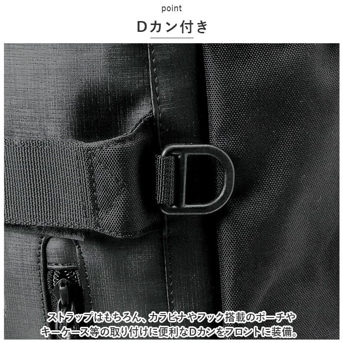 ・ストラップはもちろん、カラビナやフック搭載のポーチやキーケース等の取り付けに便利なDカンをフロントに装備。
