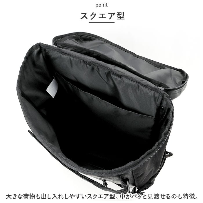 ・大きな荷物も出し入れしやすいスクエア型。中がパッと見渡せるのも特徴。