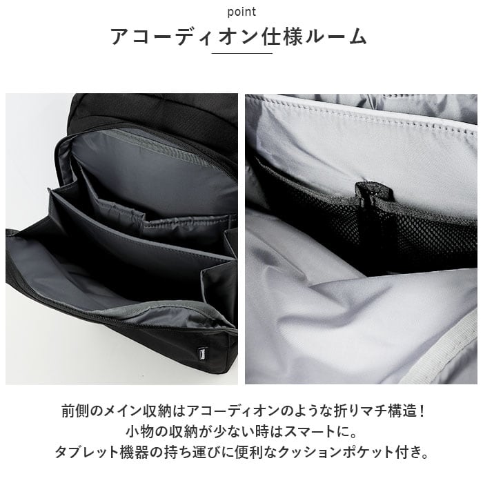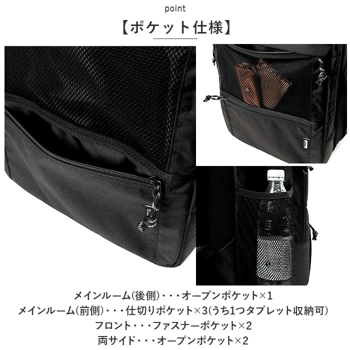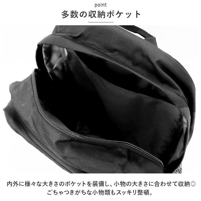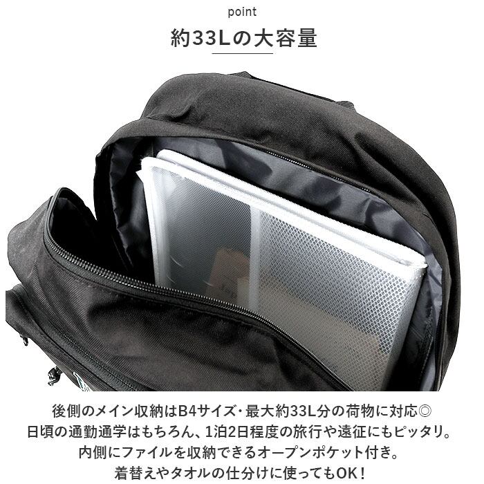 ・後側のメイン収納はB4サイズ・最大約33L分の荷物に対応◎日頃の通勤通学はもちろん、1泊2日程度の旅行や遠征にもピッタリ。