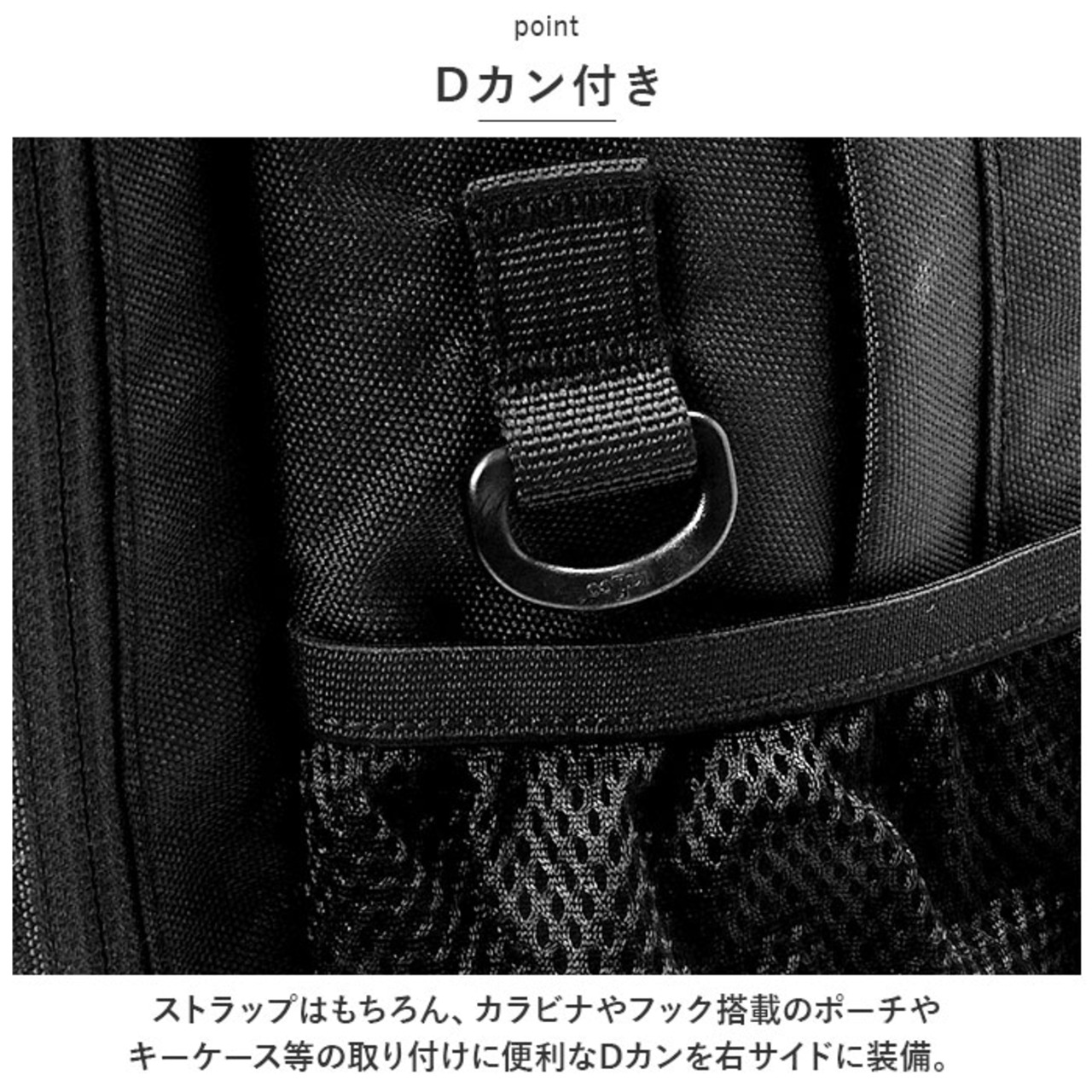・ストラップはもちろん、カラビナやフック搭載のポーチやキーケース等の取り付けに便利なDカンを右サイドに装備。