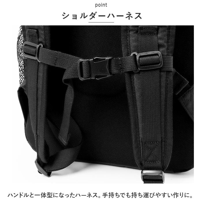 ・ハンドルと一体型になったハーネス。手持ちでも持ち運びやすい作りに。