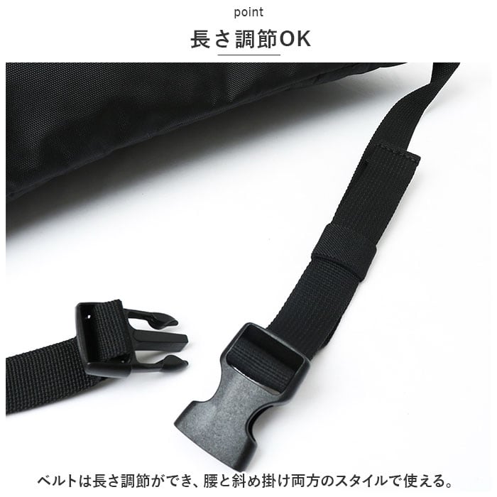・ベルトは長さ調節ができ、腰と斜め掛け両方のスタイルで使える。