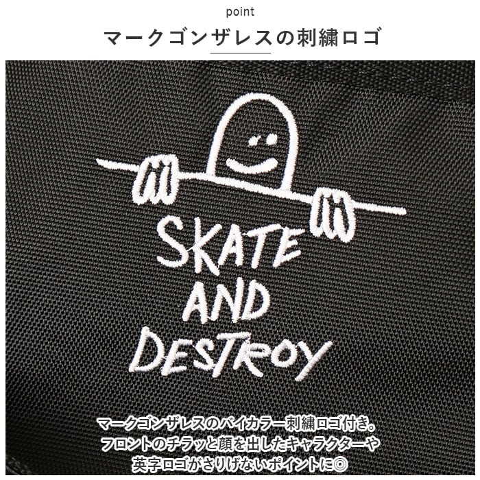 ・マークゴンザレスのバイカラー刺繍ロゴ付き。フロントのチラッと顔を出したキャラクターや英字ロゴがさりげないポイントに◎